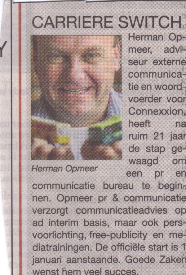 Herman Opmeer, adviseur externe communicatie en woordvoerder van Connexxion, heeft na ruim 21 jaar de stap gewaagd om een PR en communicatiebureau te beginnen. Opmeer PR & Communicatie verzorgt communicatieadvies op ad interim basis, maar ook persvoorlichting, free-publicity en mediatrainingen. De officiële start is 1 januari aanstaande. Goede Zaken wenst hem veel succes.